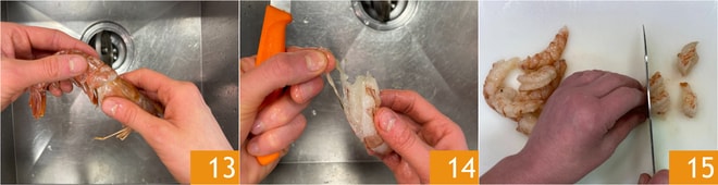 Enquanto isso, dedique-se aos camarões: separe a cabeça do corpo 13, depois remova o exoesqueleto e as patas e retire a linha preta nas costas 14. Devem render cerca de 200 g de polpa, que você cortará em pedaços grandes 15.