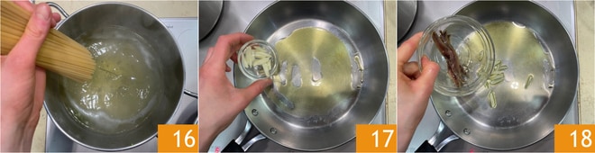 Cozinhe o espaguete na água do cozimento dos brócolis 16. Enquanto isso, aqueça um fio de azeite em uma frigideira grande junto com os dentes de alho cortados em fatias 17 e as anchovas 18. Você também pode temperar com uma pitada de pimenta.