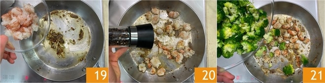 Quando as anchovas se dissolverem, adicione os camarões 19, sal e pimenta 20. Salteie os camarões por 3-4 minutos em fogo médio; eles não devem ficar completamente cozidos. Neste ponto, adicione os brócolis 21.
