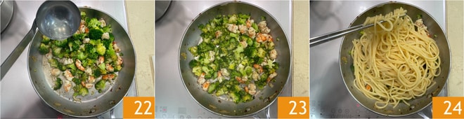 Adicione também uma concha da água de cozimento da massa 22 e cozinhe por mais um minuto 23, amassando os brócolis com uma colher de pau. Escorra o espaguete diretamente na frigideira com o molho 24 e misture brevemente para integrar.
