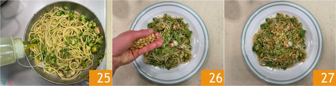 Desligue o fogo e incorpore um fio de azeite 25. Sirva e complete com a farofa crocante 26. Seu espaguete com brócolis e camarões está pronto para ser degustado 27!