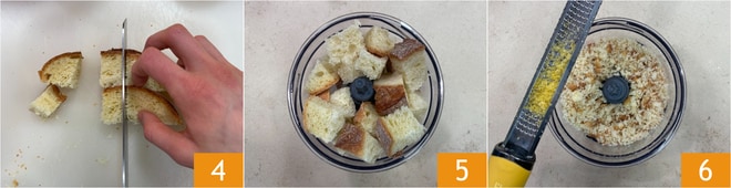 Passe para a farofa aromatizada: corte o pão amanhecido em cubos grandes 4, coloque-os em um processador 5 e triture até obter migalhas grosseiras, depois aromatize com a casca de limão ralada 6.