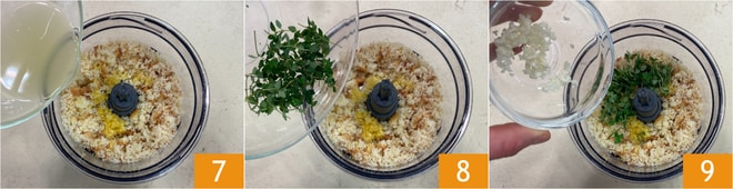 Adicione também o suco de limão 7, as folhas de tomilho 8 e o dente de alho picado 9.