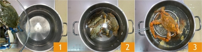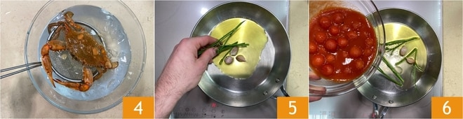 Para preparar o espaguete com caranguejo azul, a primeira coisa a fazer é colocar uma panela cheia de água no fogo. Assim que ferver, mergulhe os caranguejos 1 e deixe cozinhar por 5 minutos 2. Depois, escorra-os 3.