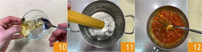 Adicione a carne de caranguejo 13 e cozinhe por mais 2 minutos, para que o sabor apure. Escorra o espaguete al dente e transfira-o para a frigideira 14. Salteie 15.