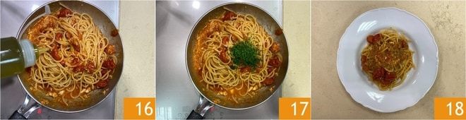 Regue com um fio de azeite 16, acrescente a salsinha picada 17 e misture novamente. Transfira para os pratos 18 e sirva o espaguete com caranguejo azul ainda quente!