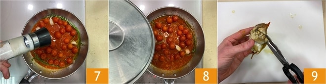 Tempere com sal 7 e pimenta. Cubra com uma tampa 8 e deixe cozinhar por 30 minutos. Neste ponto, pegue os caranguejos novamente. Quebre a carapaça com a ajuda de uma tesoura 9.
