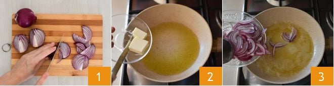 Para preparar os spaghetti com cebolas roxas, nozes e gorgonzola, primeiro descasque as cebolas e depois fatie-as 1. Em uma frigideira, aqueça o azeite em fogo baixo e depois adicione a manteiga 2. Assim que a manteiga derreter, adicione as cebolas 3. Refogue-as por 5 minutos.
