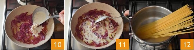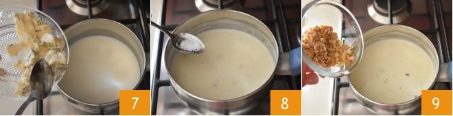 Em uma panelinha, coloque o leite e aqueça-o, adicione o gorgonzola em cubos 7 e deixe derreter completamente. Neste ponto, adicione sal 8, pimenta e as nozes picadas 9. Misture e cozinhe por mais 10 minutos. Enquanto isso, coloque uma panela cheia de água salgada para ferver, que será utilizada para cozinhar a massa.