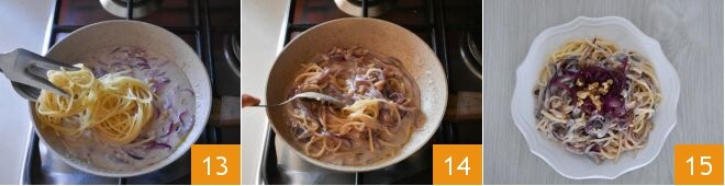Escorra a massa diretamente na frigideira com o molho, com o fogo desligado 13, misture para dar sabor 14 e sirva os spaghetti com cebolas roxas, nozes e gorgonzola bem quentes 15.
