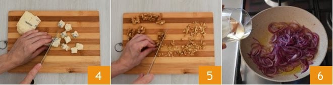 Enquanto isso, corte o gorgonzola em cubos 4 e pique as nozes 5. Quando as cebolas estiverem mais macias, adicione o vinho branco 6, deixe o álcool evaporar e depois desligue o fogo.