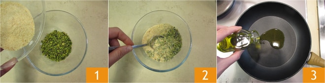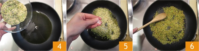 Adicione a farinha de rosca e os pistaches 4, salgue levemente 5 e cozinhe por alguns minutos, mexendo sempre 6 para obter uma tostagem uniforme. Quando estiverem bem crocantes, tostados e perfumados, retire tudo do fogo e deixe esfriar.
