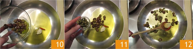 Adicione também as azeitonas 10 e as alcaparras 11. Quando tudo começar a fritar, cozinhe por cerca de um minuto, depois retire o alho e a pimenta 12.