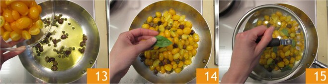 Adicione os tomatinhos amarelos 13 e salteie em fogo alto por 5 minutos. Adicione uma pitada de açúcar para equilibrar a acidez do tomate, se necessário, e tempere com algumas folhas de manjericão rasgadas com as mãos 14. Cozinhe por cerca de quinze minutos, em fogo baixo, tampando a panela 15