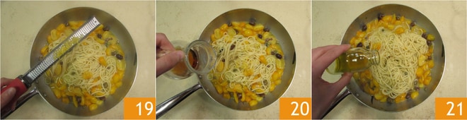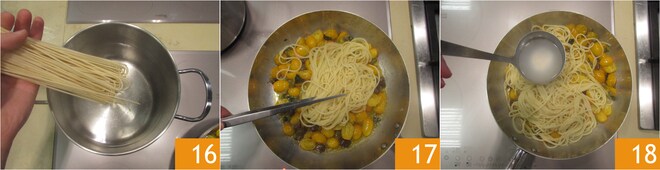 Leve a ferver uma panela de água levemente salgada (lembre-se que a colatura, assim como as alcaparras, já são muito salgadas): cozinhe a massa e retire 4 minutos antes do tempo indicado na embalagem 16. Escorra a massa e termine o cozimento diretamente na frigideira 17, ajudando-se com a água do cozimento da massa conforme necessário 18.