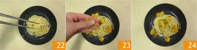 Sirva imediatamente 22 cobrindo tudo com o crumble de pistaches 23. Os spaghetti com colatura de anchovas e tomatinhos estão prontos para serem saboreados 24.