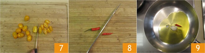 Lave os tomatinhos, depois corte-os ao meio no sentido do comprimento 7; reserve. Para o molho: corte a pimenta ao meio 8, aqueça em uma frigideira ampla o óleo junto com um dente de alho esmagado e meia pimenta 9
