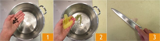 Para preparar os spaghetti com creme de pimentão e polvo, comece cozinhando o polvo: encha uma panela grande com água, depois adicione uma pitada de sal grosso, pimenta-do-reino em grãos 1, meio limão cortado ao meio e a casca do limão inteiro 2. Esmague o alho para liberar melhor seu aroma 3.
