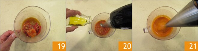 Coloque os pimentões cozidos em um copo alto 19 e bata adicionando o óleo em fio 20, até obter um creme liso e homogêneo 21. Reserve.