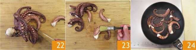 Uma vez cozido, coloque o polvo em uma tábua de corte, separe os tentáculos do restante do corpo 22 e pincele-os com um pouco de azeite de oliva 23. Grelhe o polvo em uma frigideira quente 24 para torná-lo crocante por fora.