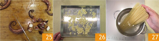 Retire do fogo os tentáculos e corte-os em pedaços 25. Torre no forno estático a 170° por 2-3 minutos as amêndoas em lâminas 26. Coloque no fogo uma panela cheia de água salgada. Quando ferver, cozinhe os spaghetti três minutos a menos do tempo indicado na embalagem 27.