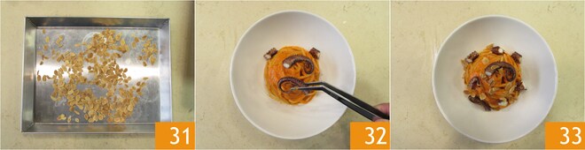 Recupere as amêndoas torradas 31 e sirva imediatamente os spaghetti com creme de pimentões, o polvo 32 e as amêndoas 33.