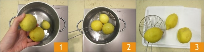 Para preparar os spaghetti com limão assado e camarões, comece pelo creme de limões. Lave-os bem e mergulhe-os em água fervente 1. Cozinhe por cerca de 25-30 minutos até que fiquem macios. Escorra-os 2, reservando a água, e transfira-os para uma bandeja com papel absorvente 3. Deixe esfriar um pouco e seque-os bem.