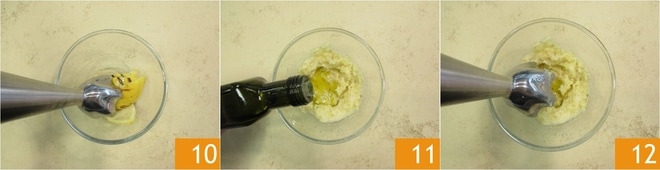 Bata com um mixer de imersão 10 até obter um creme, adicionando água conforme necessário. Agora adicione um pouco de óleo em fio 11 e bata novamente 12.