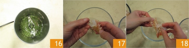 Deixe esfriar por alguns segundos, depois triture com um moedor de café para pulverizá-las 16. Limpe os camarões, removendo a cabeça, o filamento interno 17 e a carapaça 18.