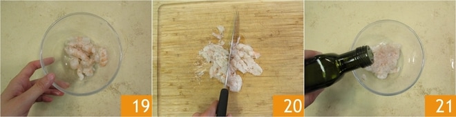 Depois de limpá-los todos 19, pique-os com uma faca 20 para preparar o tartare. Transfira para uma tigelinha e tempere com óleo 21, sal e pimenta.