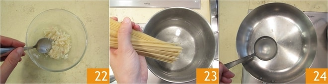 Misture bem e reserve na geladeira 22. Cozinhe a massa em água fervente salgada 23. Enquanto isso, em uma panela, adicione uma concha da água do cozimento 24.