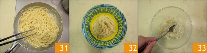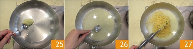 Adicione um pouco do creme de limões 25 e misture para dissolvê-lo 26. Escorra a massa al dente e transfira para o molho 27.