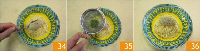 Coloque sobre a massa 34, depois usando uma peneira, polvilhe o manjericão por cima 35. Os spaghetti estão prontos, agora é só servir 36.