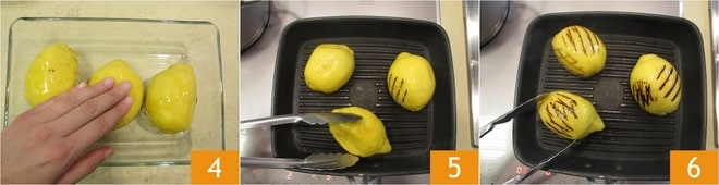 Pincele-os com óleo, de modo a untá-los bem de todos os lados 4 e posicione-os em uma grelha quente. Quando começarem a formar as típicas linhas, você pode virá-los 5. Continue assim até grelhar bem todos os lados 6.