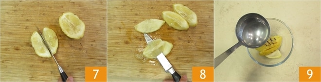 Agora corte-os em fatias 7, retire a polpa, as sementes e a parte branca 8. Você deve obter apenas a parte amarela, a casca. Transfira para uma tigelinha e adicione um pouco de água do cozimento 9.