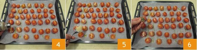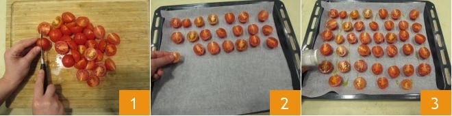 Para preparar os spaghetti com pesto de sálvia e nozes comece a preparar os tomatinhos confit. Lave-os e corte ao meio 1; depois disponha-os com a parte da polpa voltada para cima, em uma assadeira forrada com papel manteiga 2, espaçando bem entre eles. Tempere com óleo, sal 3