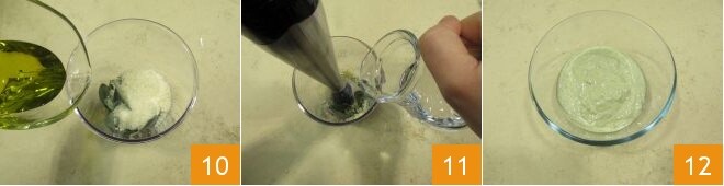 Tempere com uma pitada de sal, pimenta e adicione o óleo 10. Comece a bater com um mixer de imersão, despejando a água em fio 11 até obter um pesto liso e homogêneo que você transferirá para uma tigelinha 12.