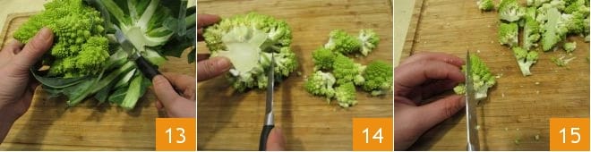 Neste ponto, coloque no fogo uma panela cheia de água, salgada a gosto, e comece a limpar o brócolis romano: elimine a base 13 e com uma faquinha separe os buquês 14. Se estiverem muito grandes, corte-os ao meio 15.