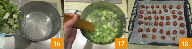 Quando a água começar a ferver, adicione os brócolis 16 e cozinhe por cerca de 7 minutos; depois adicione os spaghetti e continue a cozinhar por mais 8 minutos 17. Neste ponto, seus tomatinhos confit estarão prontos, retire do forno 18