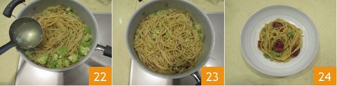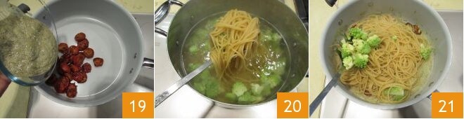 e transfira-os para uma frigideira junto com o pesto 19. Assim que a massa estiver cozida, mas ainda al dente, escorra-a reservando a água de cozimento 20. Transfira para a outra frigideira com o pesto, adicionando também os brócolis 21,