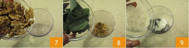 Quando faltarem cerca de 40 minutos para o cozimento dos tomatinhos, comece a preparar o pesto. Despeje no copo de um mixer as nozes 7, as folhas de sálvia bem lavadas e secas 8 e os dois tipos de queijo 9.