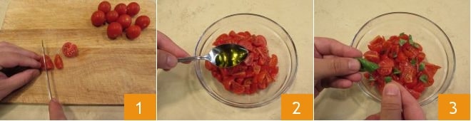 Para preparar os espaguetes com mexilhões à catalã, comece pelos tomatinhos. Lave-os em água corrente fresca e seque-os. Retire o talo verde e corte-os em quartos 1. Coloque-os numa tigela, ajuste o sal e adicione um fio de azeite 2. Pique as folhas de manjericão grosseiramente 3 e reserve.
