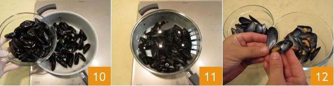 Coloque-os em uma panela antiaderente 10, aqueça em fogo alto com a tampa 11 e espere que os mexilhões se abram, mexendo de vez em quando: levará cerca de 7-8 minutos. Uma vez prontos, reserve o líquido de cozimento, depois abra os mexilhões e retire os moluscos 12.