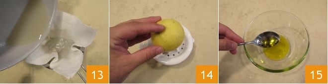 Coe o líquido dos mexilhões com uma gaze colocada sobre uma tigela 13, você deve obter 740 g. Neste ponto, esprema um limão 14 e despeje o suco em uma tigelinha. Adicione o azeite 15,