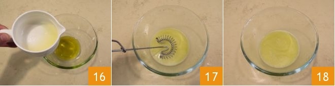 e 40 g do líquido de cozimento dos mexilhões 16; com um batedor de molas, emulsione os ingredientes 17 até obter uma mistura homogênea 18.