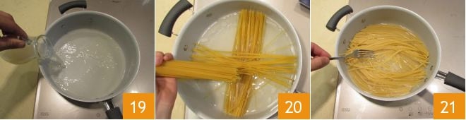 Despeje os 700 g restantes do líquido de cozimento dos mexilhões em uma panela grande junto com a água fria 19. Leve à fervura e cozinhe os espaguetes, colocando-os uniformemente na panela 20. Deixe a água de cozimento evaporar completamente, mexendo os espaguetes de vez em quando para que não grudem 21.