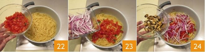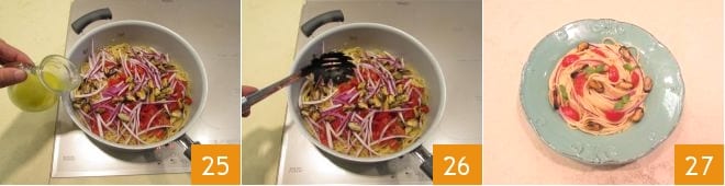 Quando faltarem 3 minutos para o término da cocção, adicione os tomatinhos 22, a cebola escorrida 23 e os mexilhões 24.