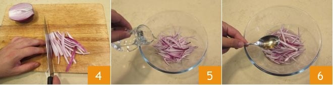 Descasque e corte a cebola, depois corte-a em fatias finas 4. Coloque-a em uma tigela com água fria 5 e vinagre 6 por cerca de 10 minutos.