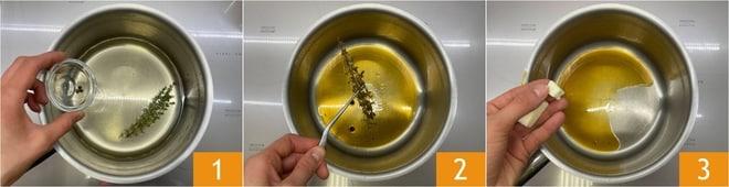 Para preparar os spaghetti com creme de alho negro, alcaçuz e avelãs, primeiro prepare a manteiga ácida: despeje o vinho branco em uma panela, em seguida, adicione os ramos de tomilho e os grãos de pimenta 1. Acenda o fogo e deixe reduzir em fogo alto até que todo o álcool tenha evaporado. Neste ponto, desligue o fogo, remova o tomilho e a pimenta 2 e adicione alguns cubos de manteiga fria da geladeira 3.