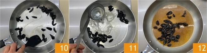 Refogue brevemente 10, depois adicione uma concha de água fervente 11 e deixe cozinhar por mais 2-3 minutos 12.